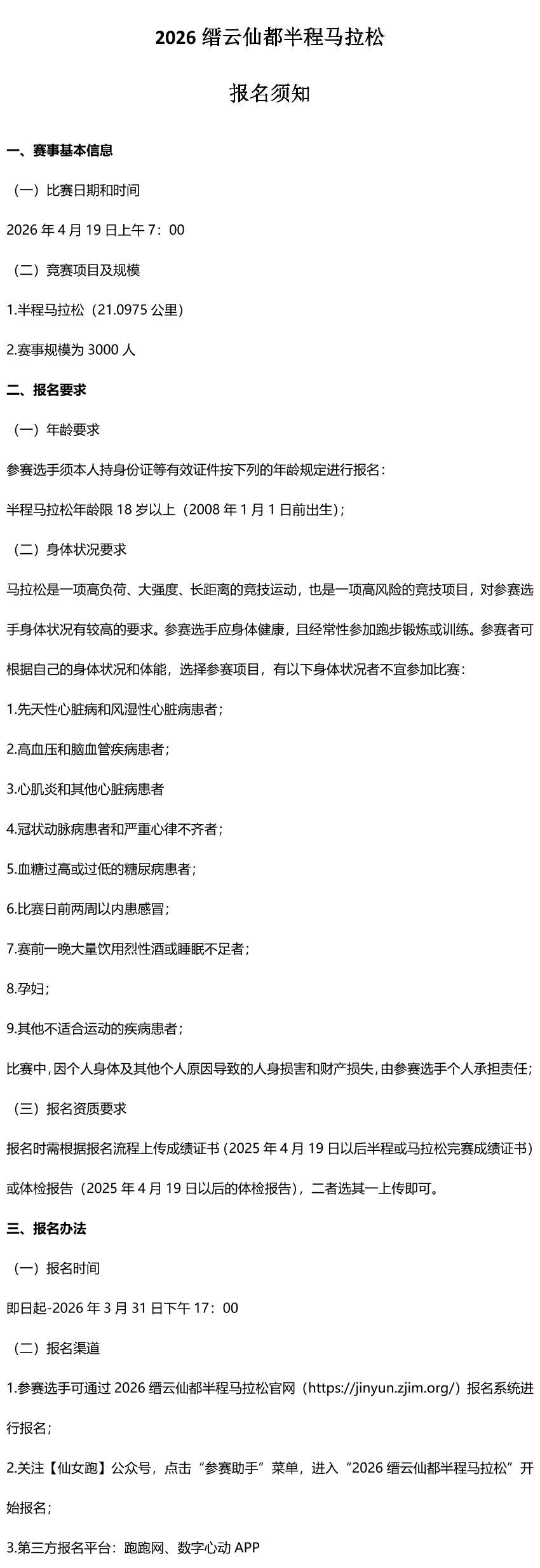 报名须知 - 2026晨龙控股缙云仙都半程马拉松